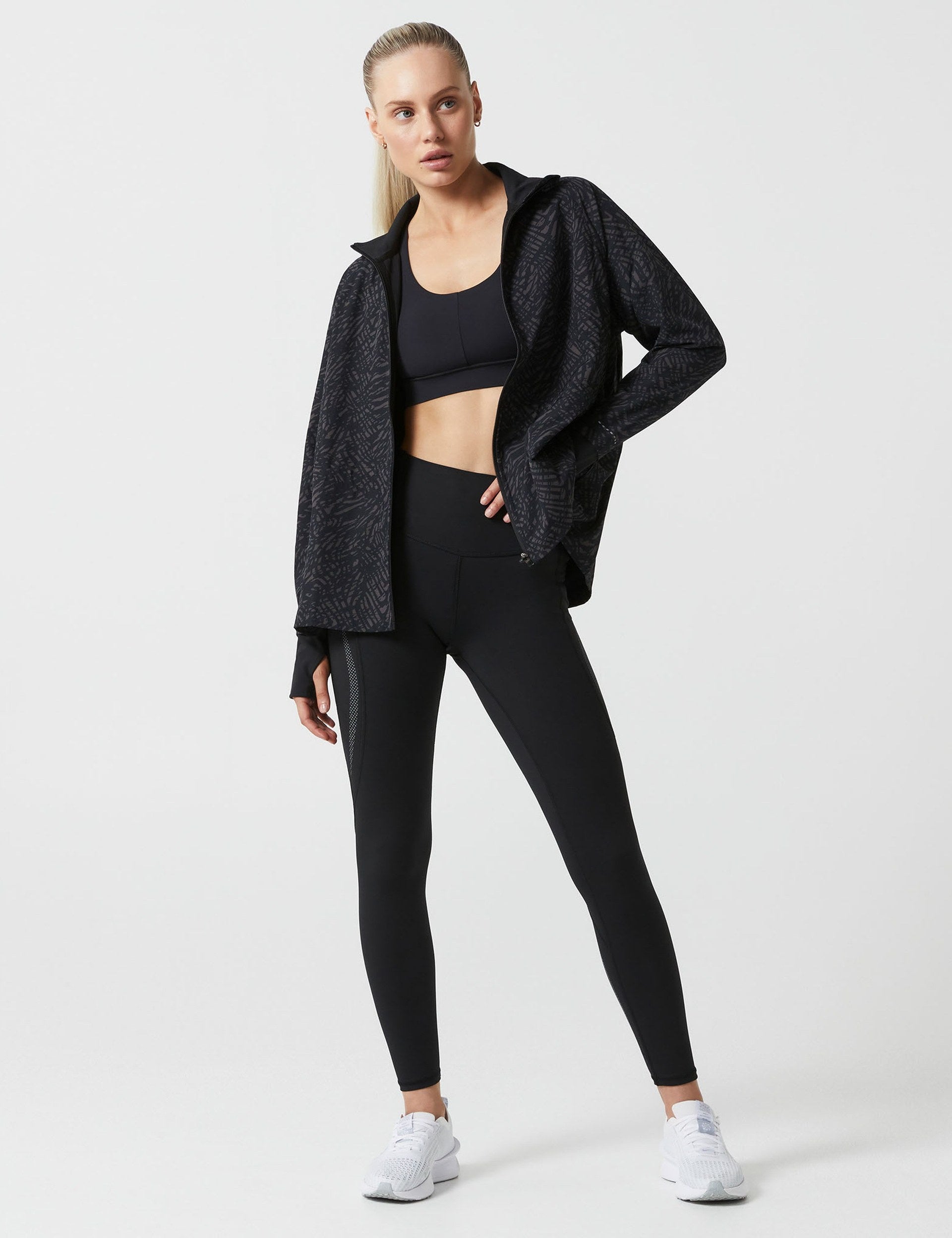 Layer up in style with the Helena Running Jacket. Designed with a flattering fitted silhouette and an elasticated waistband for a figure-hugging shape, this jacket is perfect for protecting you from the elements. It's crafted from Lilybod's signature sculpting fabric that is soft, breathable, and moisture-wicking to keep you comfortable on the move.