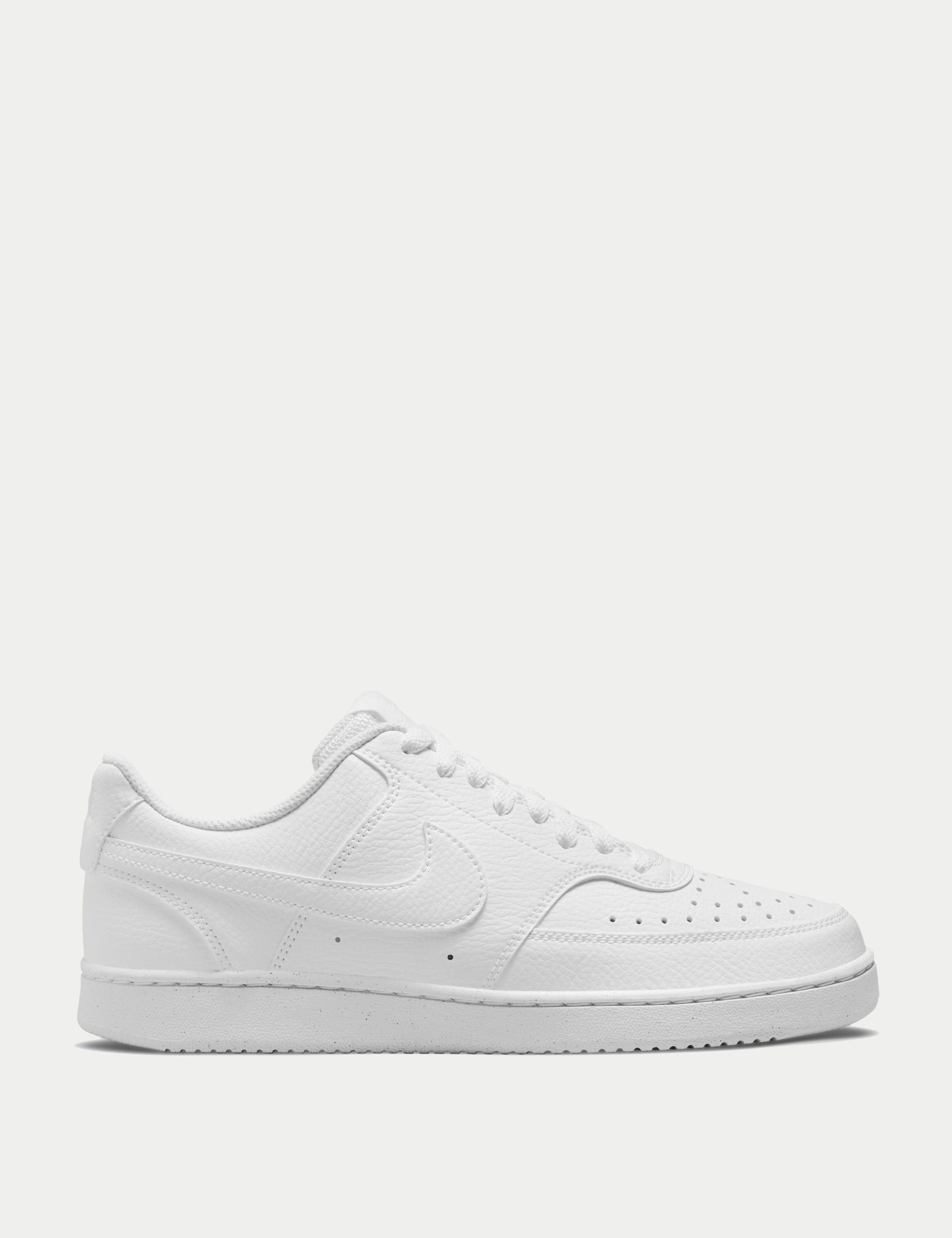 The Court Vision Low Next Nature Shoes in White channel classic 80s basketball into an everyday sneaker. A crisp all-white upper with stitched overlays nods to retro courts, while a padded, low-cut collar and breathable toe box deliver all-day comfort. Finished with a vulcanized look and a durable rubber sole for reliable city traction.