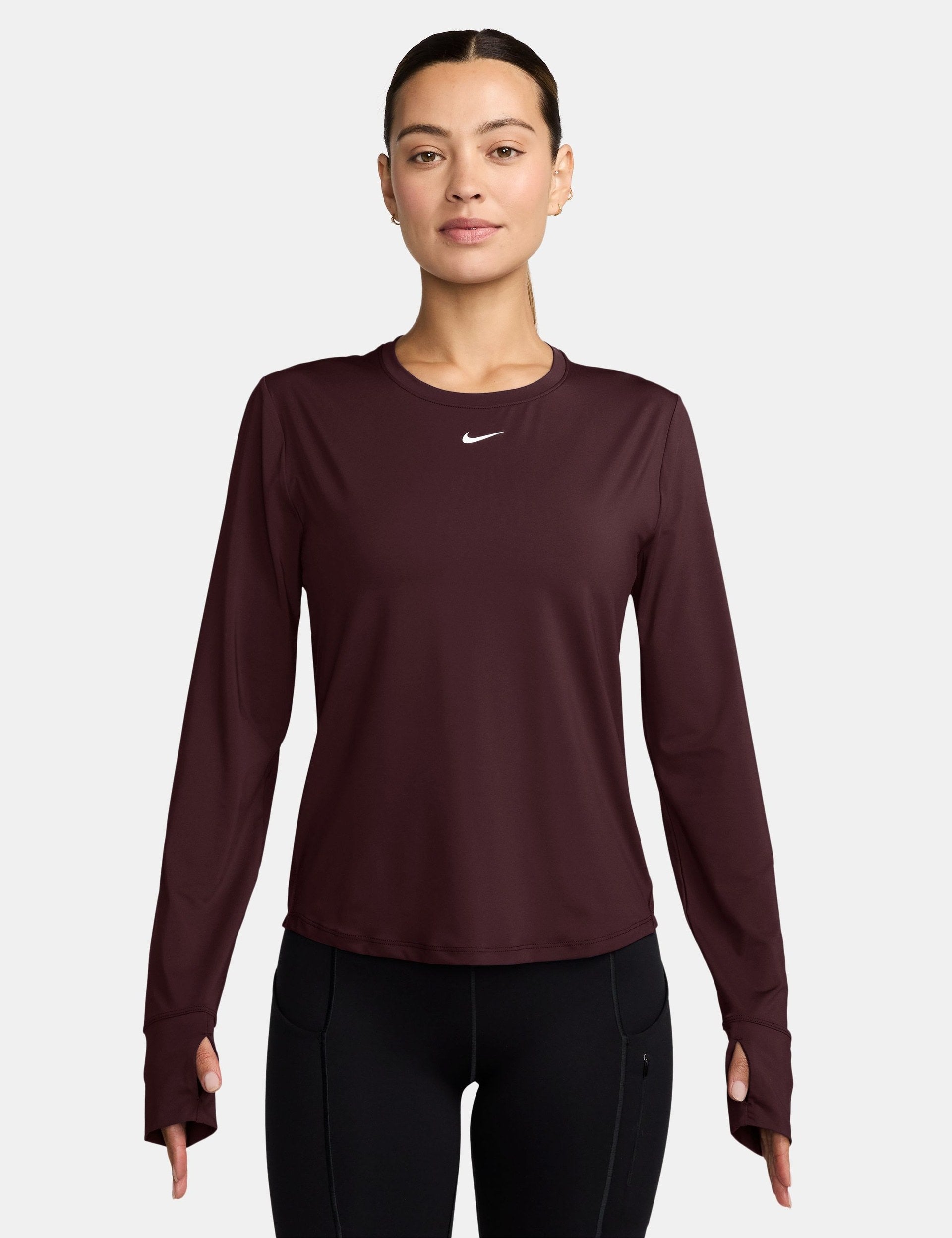 Stay focused during power workouts with the One Classic Dri-FIT Long-Sleeve Top, featuring silky-smooth, lightweight fabric and Dri-FIT technology for moisture-wicking comfort that keeps you cool. Thumbholes and underarm gussets enhance mobility, while the curved hem provides added coverage for intense sessions, making it ideal for layering during strength training or cardio.