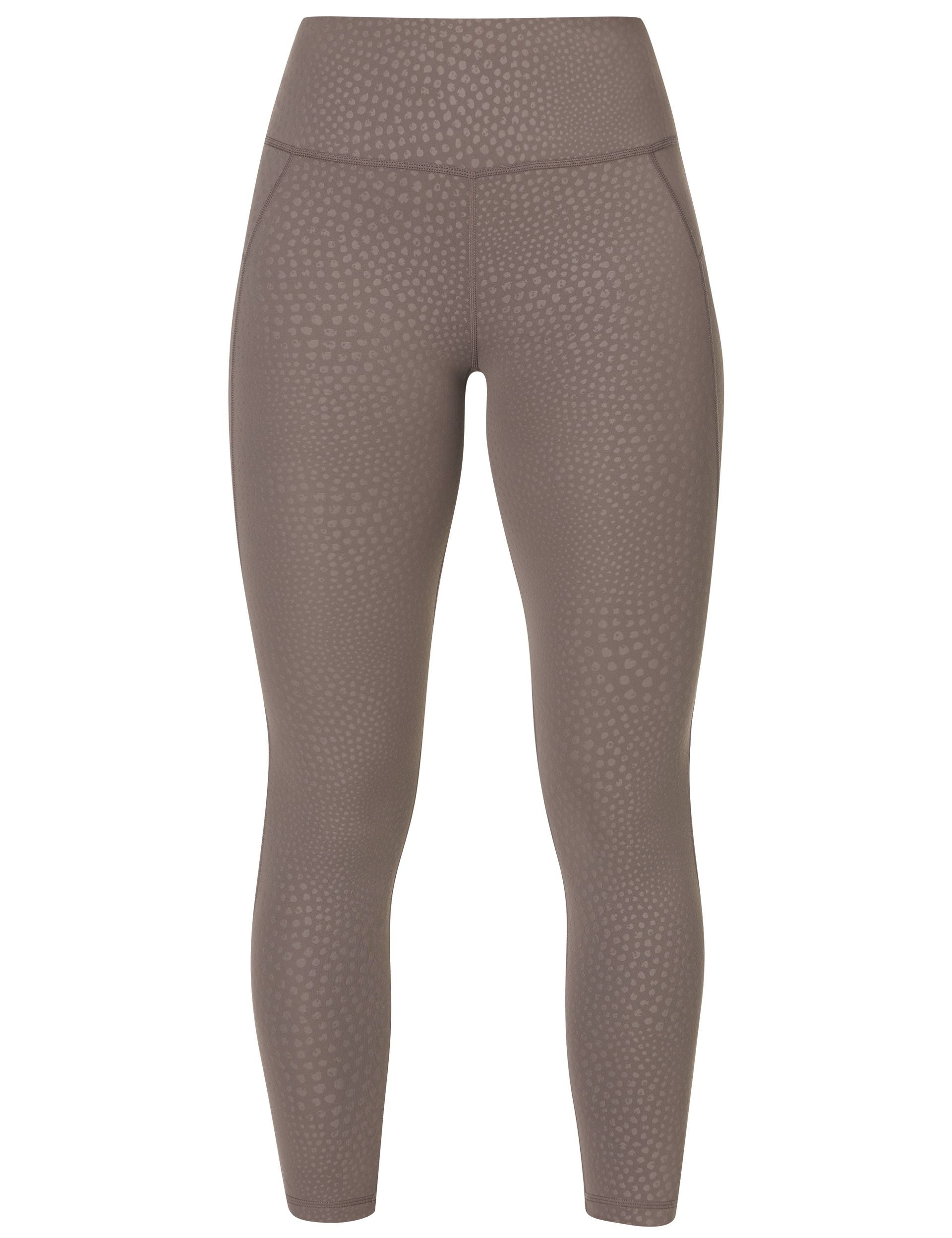 The Sweaty Betty All Day 7/8 Leggings in Brown Reptile Emboss Print deliver lightweight comfort for studio sessions and daily wear. Crafted from soft, sweat-wicking fabric, these leggings feel weightless while providing squat-proof coverage. The high-rise waistband features an adjustable internal drawcord to keep them in place during movement. A discreet slip pocket at the waist offers convenient storage for small items. With their stylish embossed print and cropped length, they are the perfect blend of fashion and function.