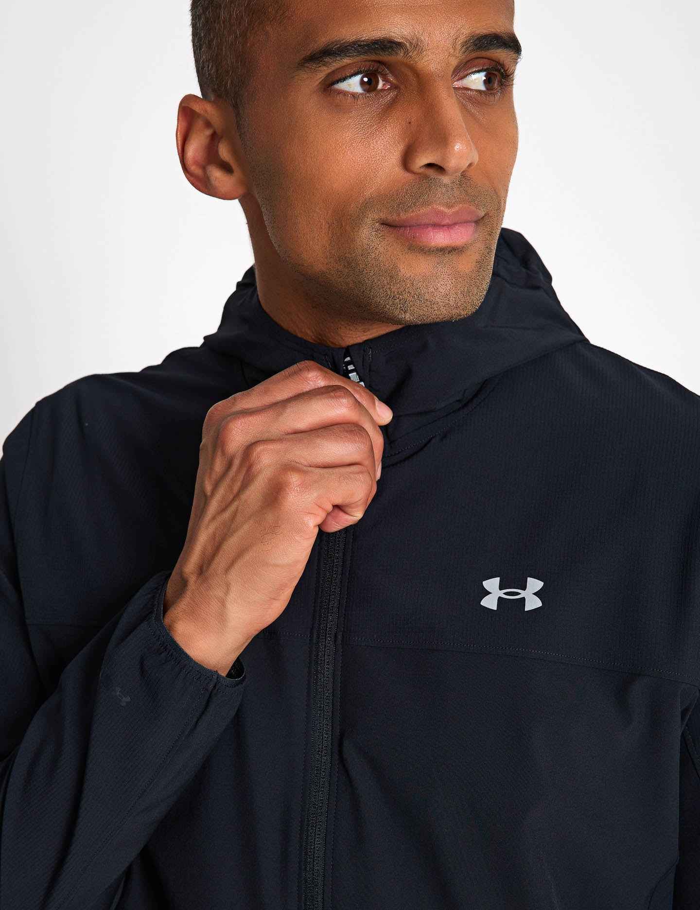 Brave unpredictable weather during intense runs with the Velociti Pro Storm Jacket - Black/Reflective. Its lightweight, stretch-woven fabric features UA Storm technology for water-resistance, delivering sleek, athletic performance without sacrificing breathability.
